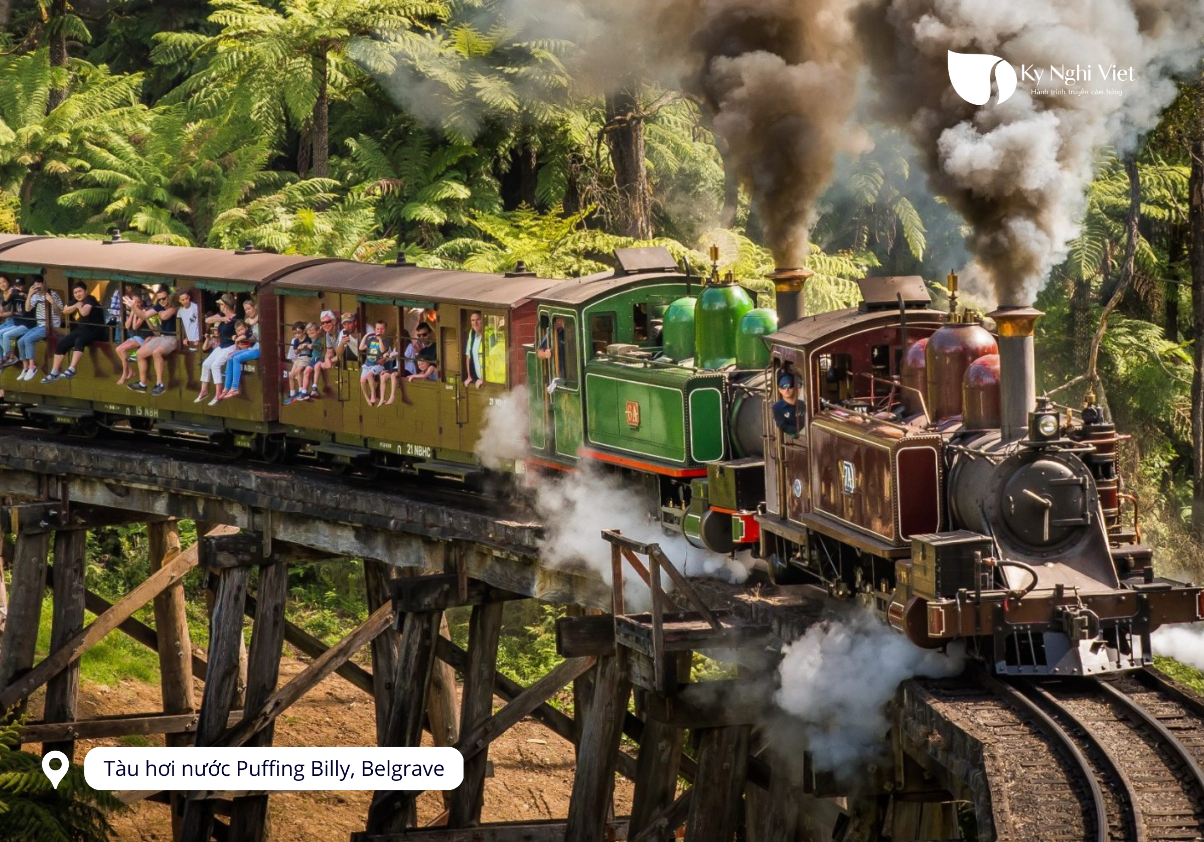 Tàu hơi nước Puffing Billy: Tiếp tục di chuyển đến Belgrave, nơi có đoàn tàu hơi nước nổi tiếng Puffing Billy, với hàng loạt hoạt động thú vị! Đoàn tàu hơi nước đã tồn tại cả thế kỷ này được bảo dưỡng cẩn thận và duy trì hoạt động cho tới ngày nay, chạy trên cung đường kéo dài từ Belgrave đến Menzies Creek.