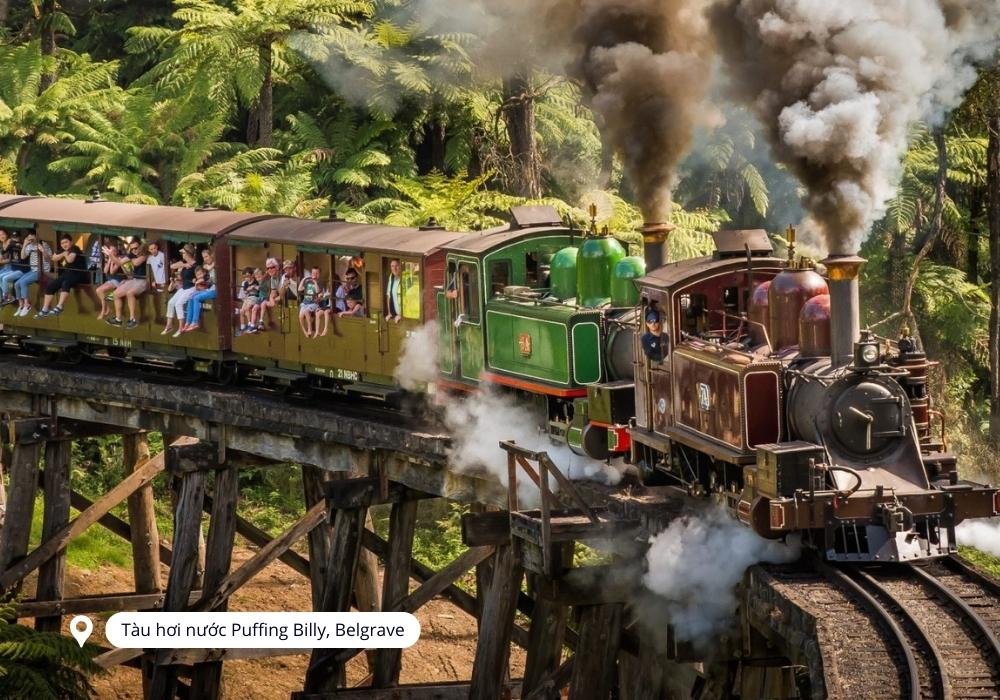 Tàu hơi nước Puffing Billy: Tiếp tục di chuyển đến Belgrave, nơi có đoàn tàu hơi nước nổi tiếng Puffing Billy, với hàng loạt hoạt động thú vị! Đoàn tàu hơi nước đã tồn tại cả thế kỷ này được bảo dưỡng cẩn thận và duy trì hoạt động cho tới ngày nay, chạy trên cung đường kéo dài từ Belgrave đến Menzies Creek.